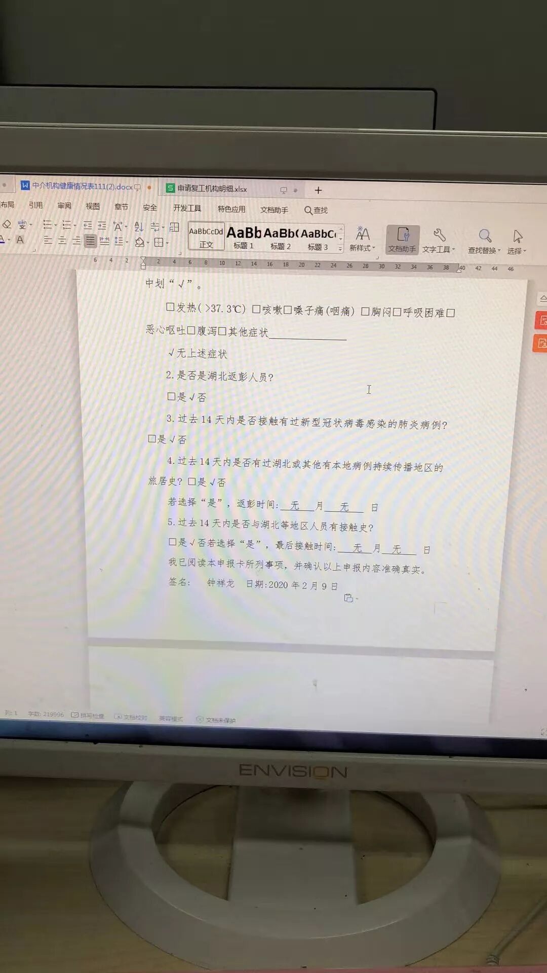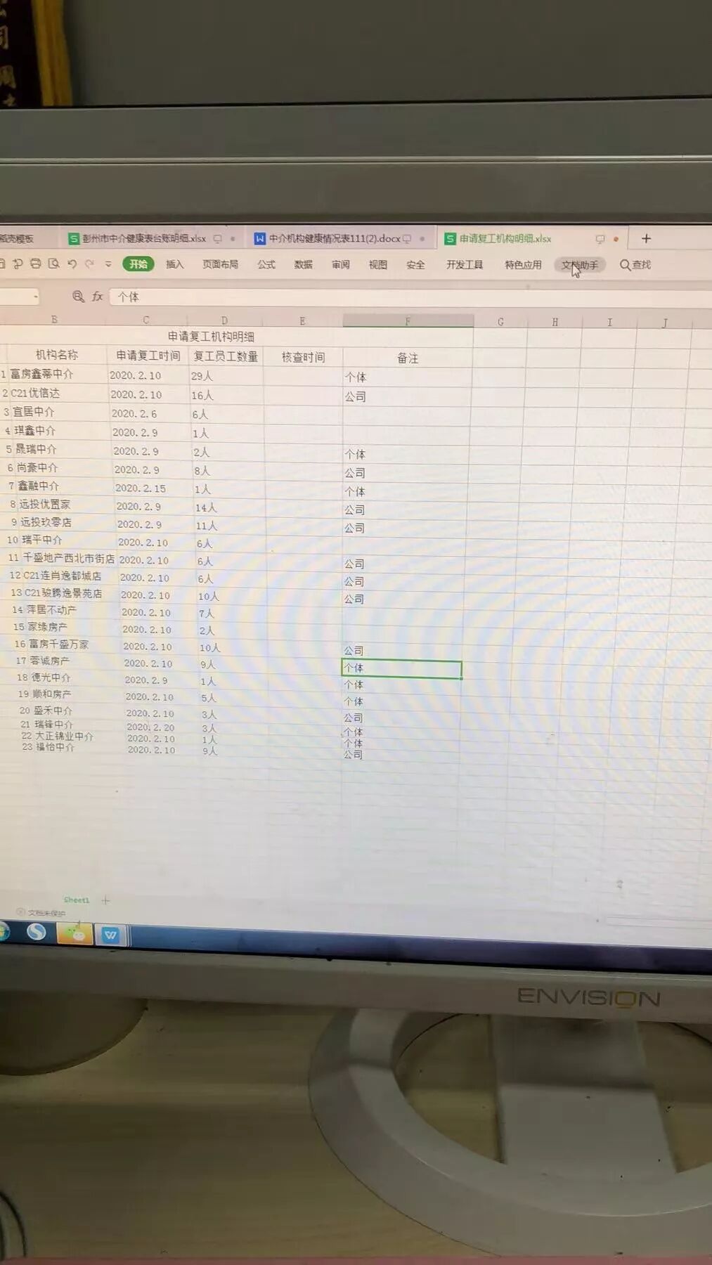 何浩主要負(fù)責(zé)協(xié)助彭州中介區(qū)域的248家中介門店的《健康情況申請(qǐng)卡臺(tái)賬統(tǒng)計(jì)》、《健康情況申請(qǐng)卡明細(xì)》、《申請(qǐng)復(fù)工機(jī)構(gòu)明細(xì)》的資料填寫;在工作過程中,富房另一位同事黃佳也主動(dòng)協(xié)助,幫忙做《返崗復(fù)工人員疫情防控知識(shí)信息采集》的統(tǒng)計(jì),兩人各司其職,工作推進(jìn)有條不紊。