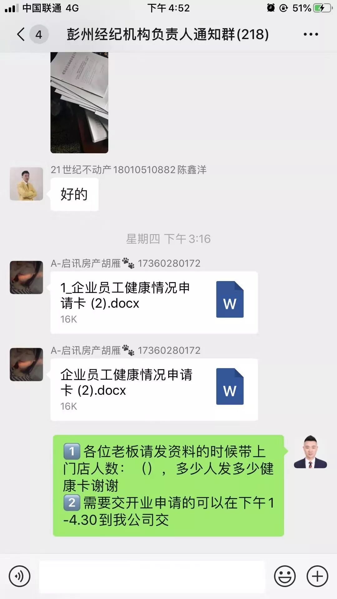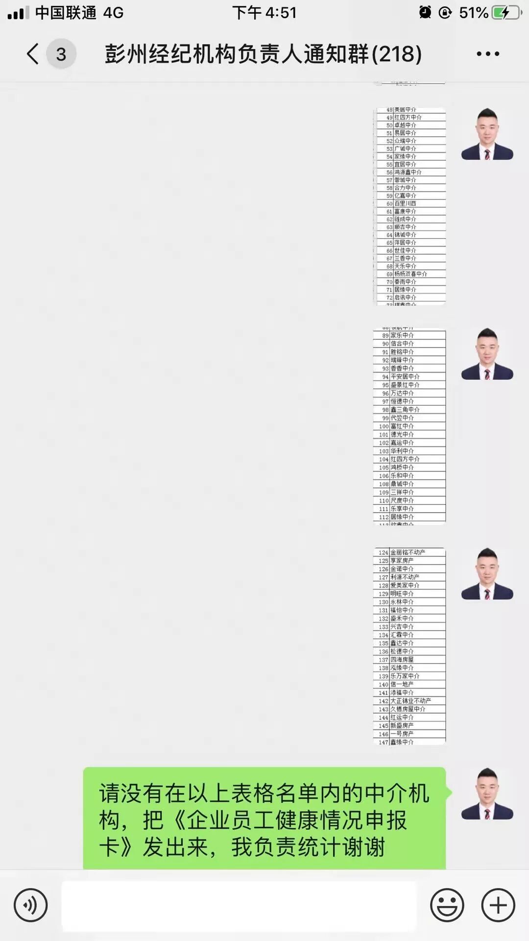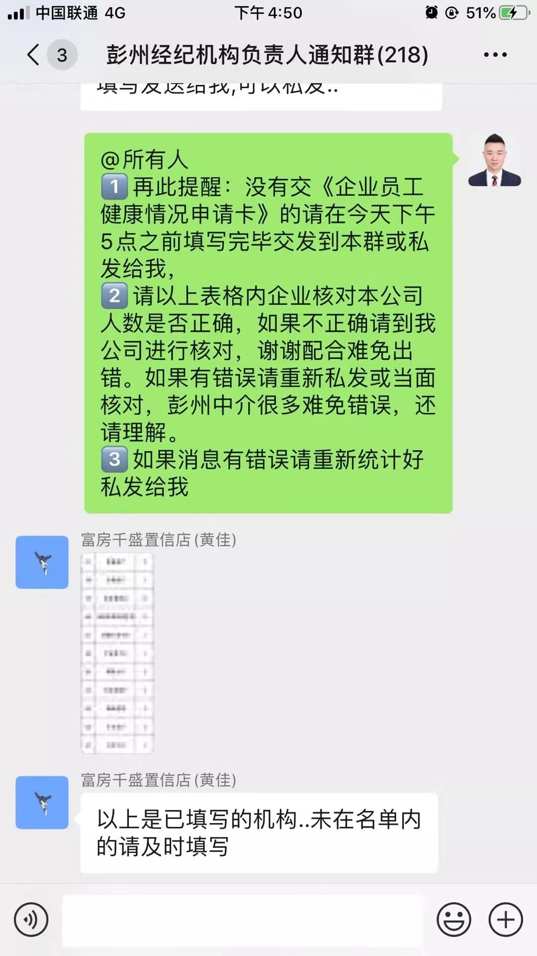 何浩首先在彭州市房管局的大群里邊,將每天的相關(guān)信息的及時(shí)傳達(dá),此群里邊有248家中介門店的負(fù)責(zé)人。每天定時(shí)定點(diǎn)的將需要填寫的表格發(fā)放到群中,督促填寫;晚上再做統(tǒng)計(jì)匯總,避免遺漏。數(shù)據(jù)的整理統(tǒng)計(jì)是一項(xiàng)繁瑣的工作,需要細(xì)致和耐心,但是何浩表示并不覺得枯燥,因?yàn)檫@是一份責(zé)任,不僅承載著彭州住建局的信任,還有各個(gè)中介門店的信任。