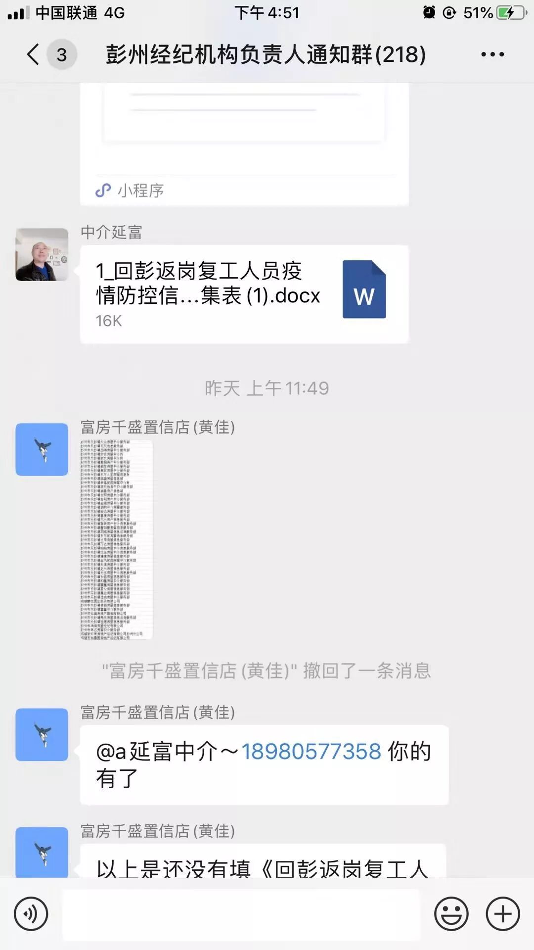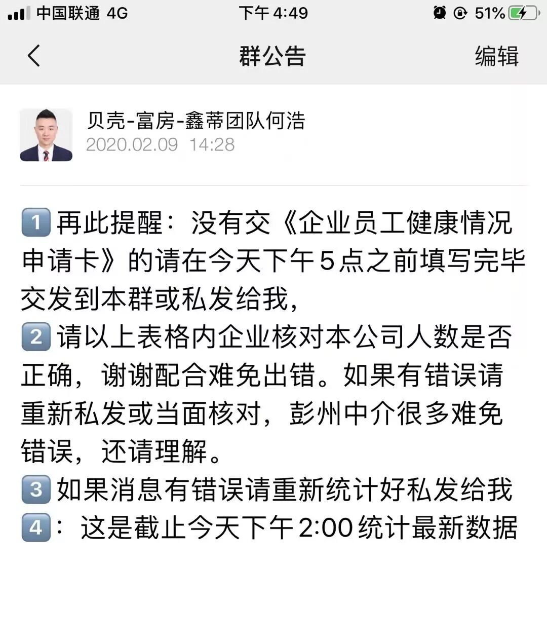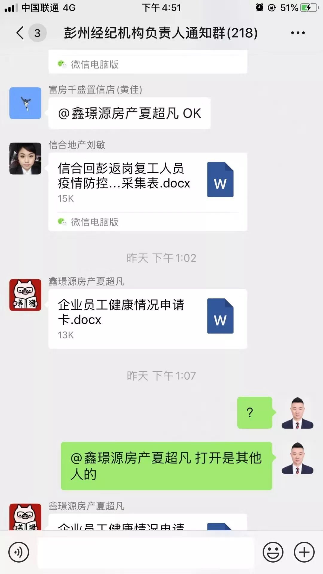 何浩首先在彭州市房管局的大群里邊,將每天的相關(guān)信息的及時(shí)傳達(dá),此群里邊有248家中介門店的負(fù)責(zé)人。每天定時(shí)定點(diǎn)的將需要填寫的表格發(fā)放到群中,督促填寫;晚上再做統(tǒng)計(jì)匯總,避免遺漏。數(shù)據(jù)的整理統(tǒng)計(jì)是一項(xiàng)繁瑣的工作,需要細(xì)致和耐心,但是何浩表示并不覺得枯燥,因?yàn)檫@是一份責(zé)任,不僅承載著彭州住建局的信任,還有各個(gè)中介門店的信任。