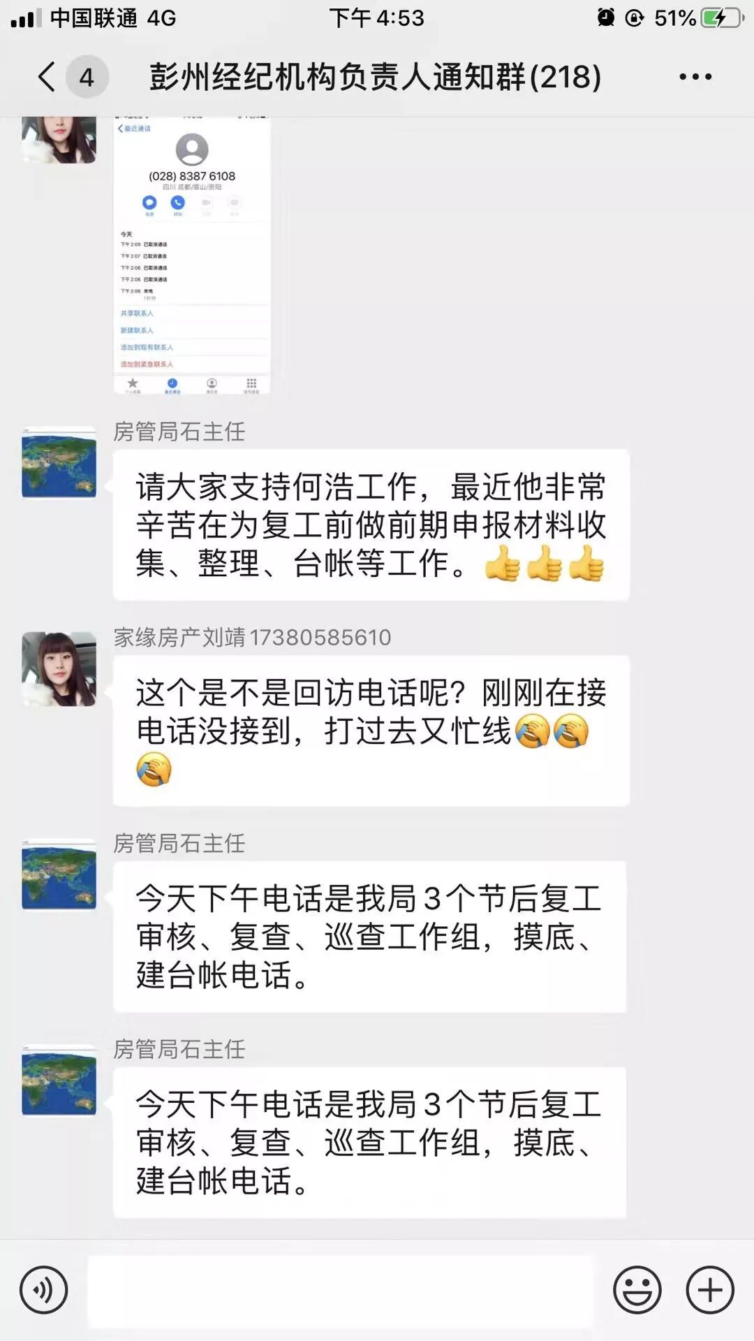 部分中介門店負(fù)責(zé)人可能沒有及時(shí)關(guān)注到群里消息,兩位同事就電話聯(lián)系,挨個(gè)的通知到位,做到每一個(gè)門店都不遺漏。何浩和黃佳說“富房的服務(wù)理念是‘用心服務(wù),讓您簡(jiǎn)單’,在這個(gè)特殊時(shí)期,我們能多一點(diǎn)細(xì)心和耐心,大家的工作也就開展得更為順暢。”